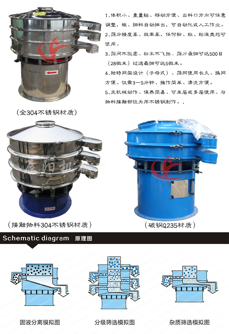 旋振篩由直立式振動電機、普通電機拖動激振器兩種振動方式,振動源上下兩端安裝有偏心重錘。下兩端重錘,配置不同,激振源在旋轉(zhuǎn)時,產(chǎn)生水平、垂直、傾斜的三次元運動,再把這個運動傳遞給篩面。調(diào)節(jié)上、下兩端的相位角,可以改變物料在篩面上的運動軌跡,達到精細篩分、除雜、過濾 的目的。